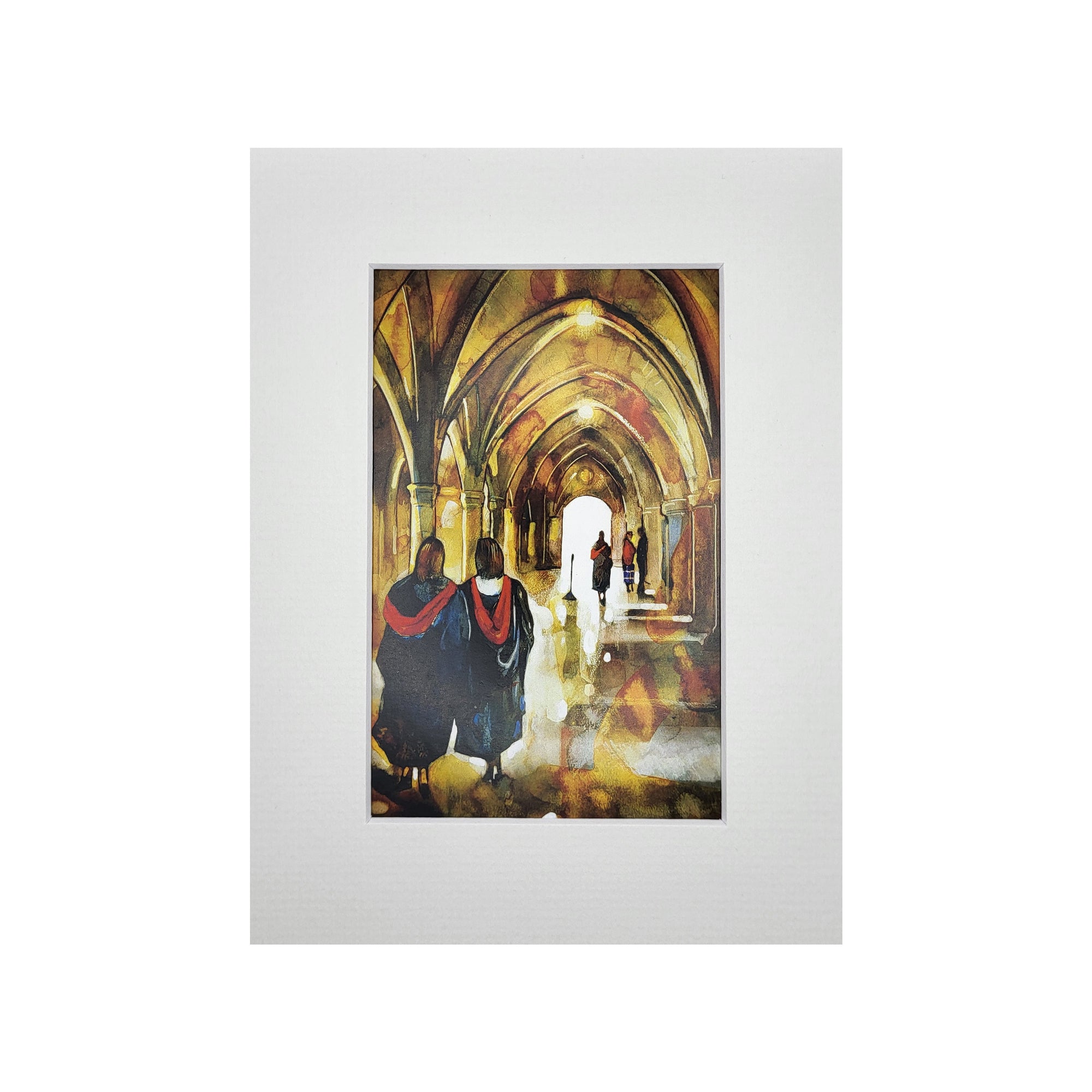Gowned students celebrating their big day in the beautiful surroundings of Glasgow University cloisters. From an original watercolour painting.